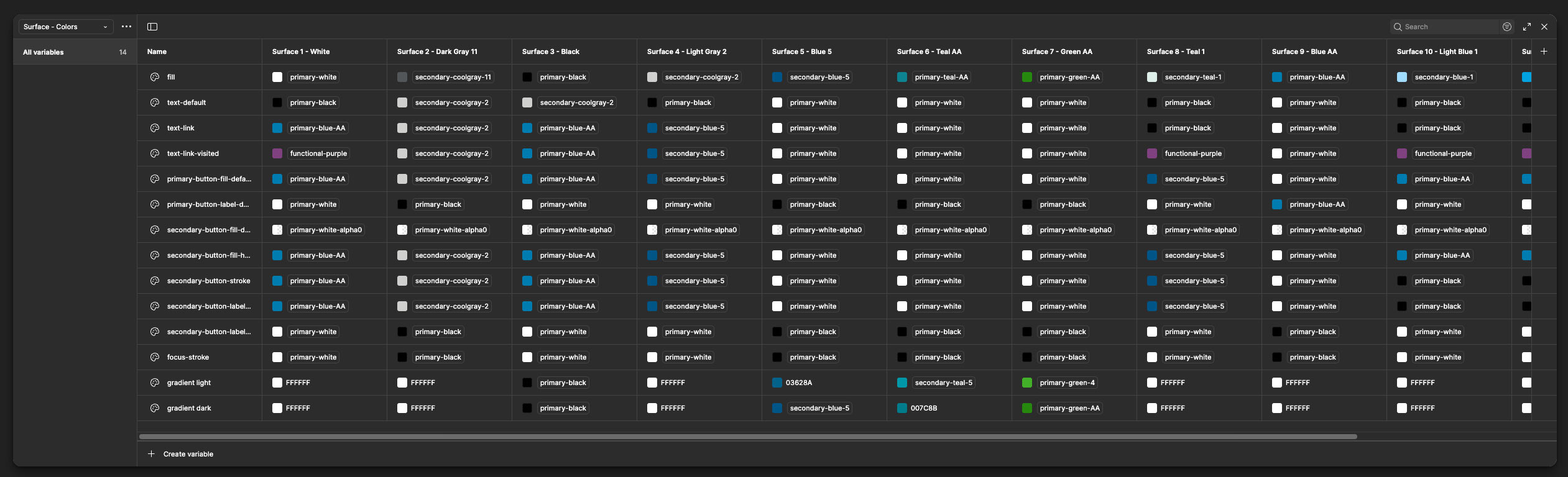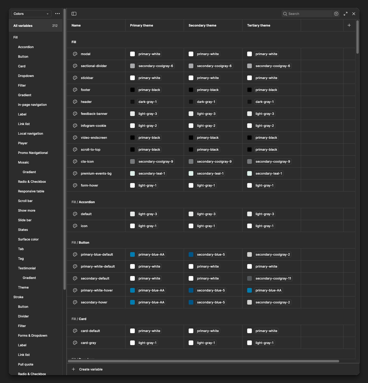 Additionally, this library made extensive use of Figma Variables to manage multi-theme and multi-mode design support: